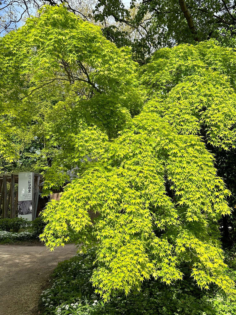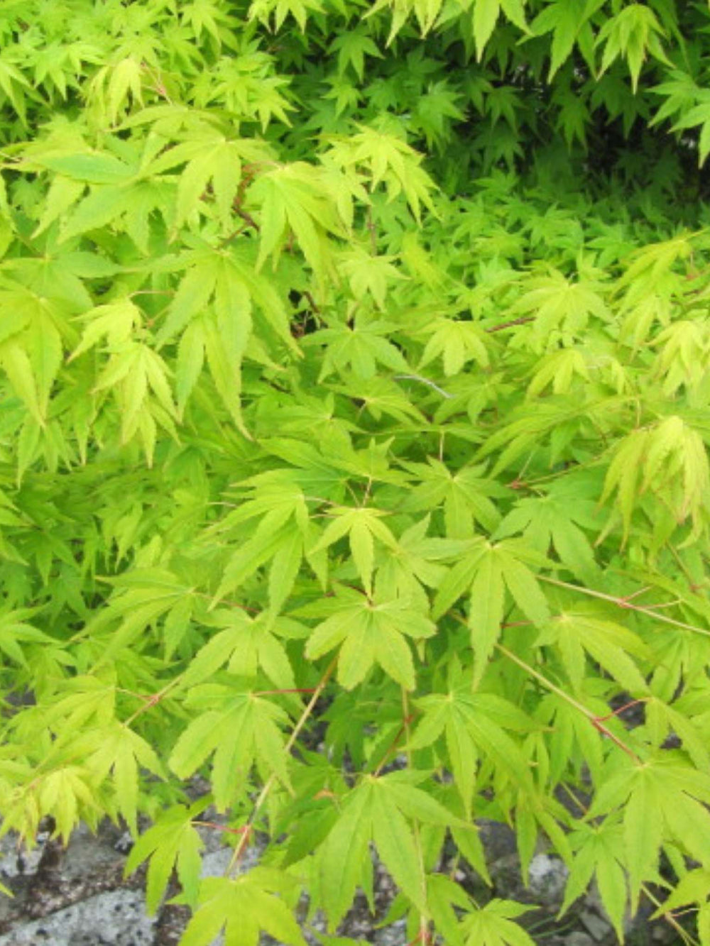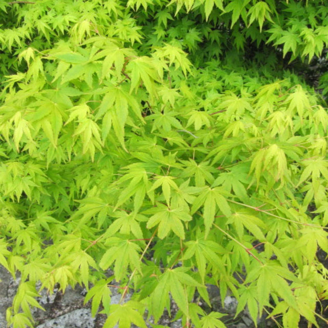 Acer palmatum ‘Aureum’, the golden Japanese maple, is a medium-sized deciduous shrub or small tree reaching around 4m tall and wide. Flowering in April and May, it bears clusters of reddish-purple blooms, with foliage shifting from bright yellow in spring to yellow-green in summer, and orange, red, and yellow tones in autumn. Bushy in habit and low maintenance, it offers reliable seasonal colour for Irish gardens.