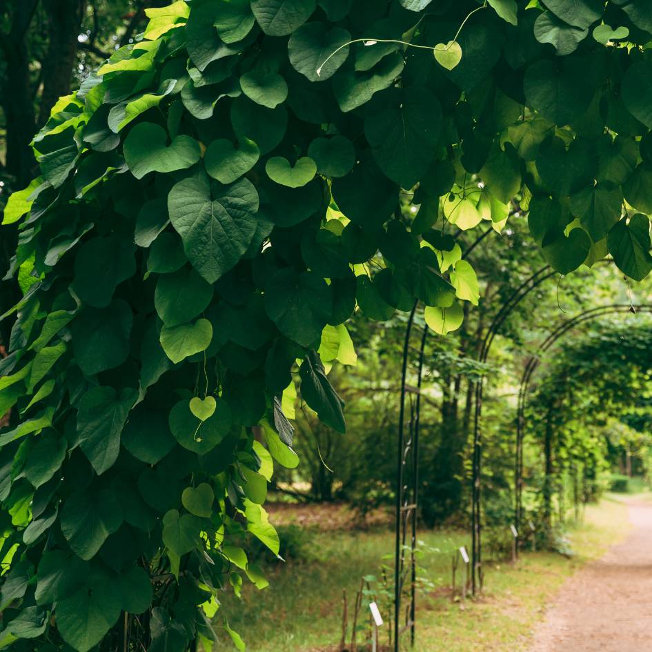 Aristolochia macrophylla, or Dutchman’s Pipe, is a vigorous climbing plant with large heart-shaped leaves that create a lush screen. In early summer, it produces unusual greenish-yellow flowers mottled with purple. Large and fast-growing, it brings strong coverage for walls or pergolas. A bold climber for Irish gardeners wanting leafy shelter and unique seasonal blooms.