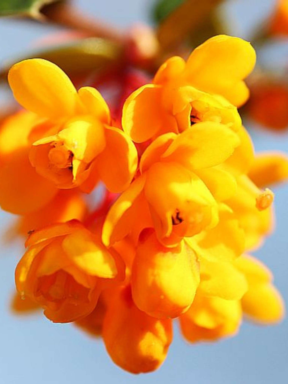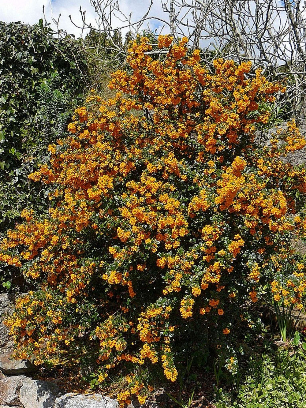 Berberis darwinii is a dense evergreen shrub with glossy green leaves and drooping racemes of orange-red flowers in spring, sometimes repeated in autumn. Large in size, it also bears blue-black berries later in the year. Recognised with the RHS Award of Garden Merit, it is valuable for pollinators and wildlife. A striking choice for Irish hedging and informal borders.