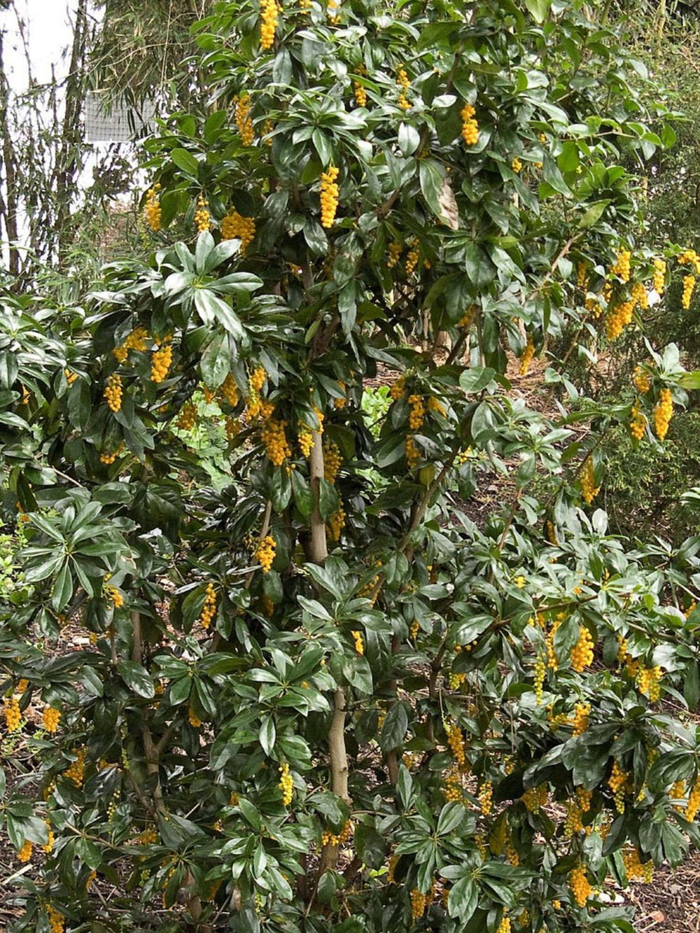 The evergreen Berberis valdiviana slowly grows into a large, handsome shrub with glossy, nearly prickle-free leaves. In May, it drapes itself with long clusters of golden yellow flowers that resemble drops of egg yolk, later giving way to small black fruit. Large and bushy, this shrub has the RHS Award of Garden Merit, thrives in a wide range of Irish conditions, and is a fine option for hedging, slopes, or low-maintenance garden designs.