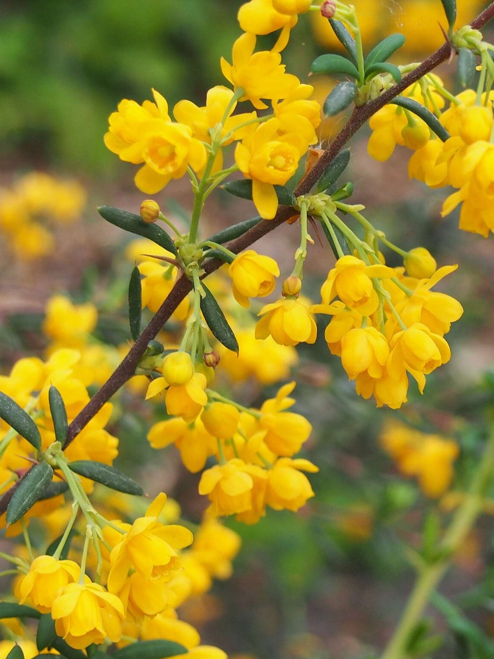 Berberis × stenophylla Lindl., known as Golden Barberry, is a large evergreen shrub with narrow, rigid foliage and a strong, arching habit. It covers itself in clusters of scented yellow flowers in spring, later producing blue-black berries. Bushy and medium to large in size, it has the RHS Award of Garden Merit, is low-maintenance, and brings both fragrance and colour. For Irish gardeners, it is a rewarding choice for hedges, banks, or large borders needing a hardy, long-lived shrub.