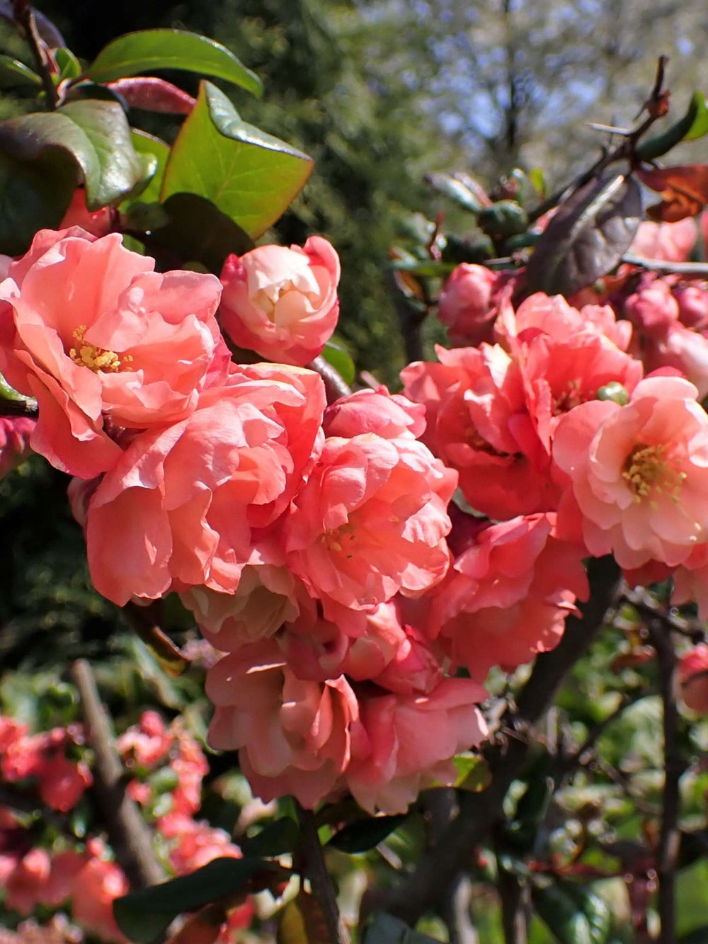 Japanese Quince ‘Falconnet Charlet’ is a medium, deciduous shrub with thorny branches and dark green leaves. In early spring, clusters of large, double salmon-pink flowers appear on bare stems, followed in summer by fragrant yellow fruits that can be used in preserves. Bushy in habit, it adds both ornamental value and seasonal harvest. For Irish gardeners wanting a spring-flowering shrub with edible fruit, this is a strong option.