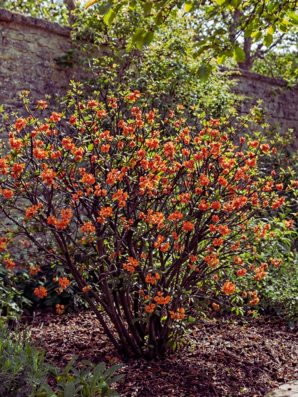 Flowering Quince ‘Orange Storm’ is a small, spreading shrub with thornless stems and glossy dark foliage. It produces clusters of double orange flowers in spring on bare branches, filling borders and hedges with colour. Deciduous and compact, it provides reliable seasonal impact. Many Irish gardeners use it to brighten city or courtyard gardens with its strong spring display.