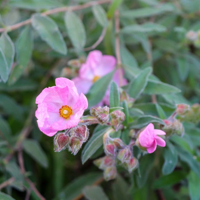 Rock Rose ‘Silver Pink’ is a rounded evergreen shrub with narrow leaves and pale pink flowers that open wide in summer. Each bloom has a white centre and appears in succession, creating weeks of display. Drought tolerant and low maintenance, it suits gravel gardens, banks, or sunny Irish borders. If you’re searching for a resilient shrub with soft pink tones, this variety is an excellent fit.