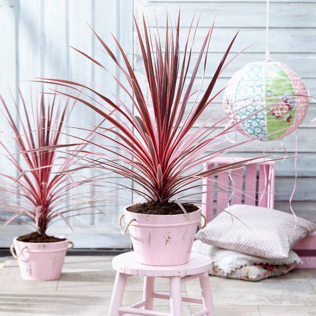 Cordyline australis ‘Charlie Boy’ features sword-like leaves in shades of burgundy and bronze edged with bright pink, forming a colourful evergreen clump. Scented white summer flowers may appear, followed by ornamental berries. Both drought resistant and fragrant, it is a strong architectural addition to sheltered Irish borders and container displays.