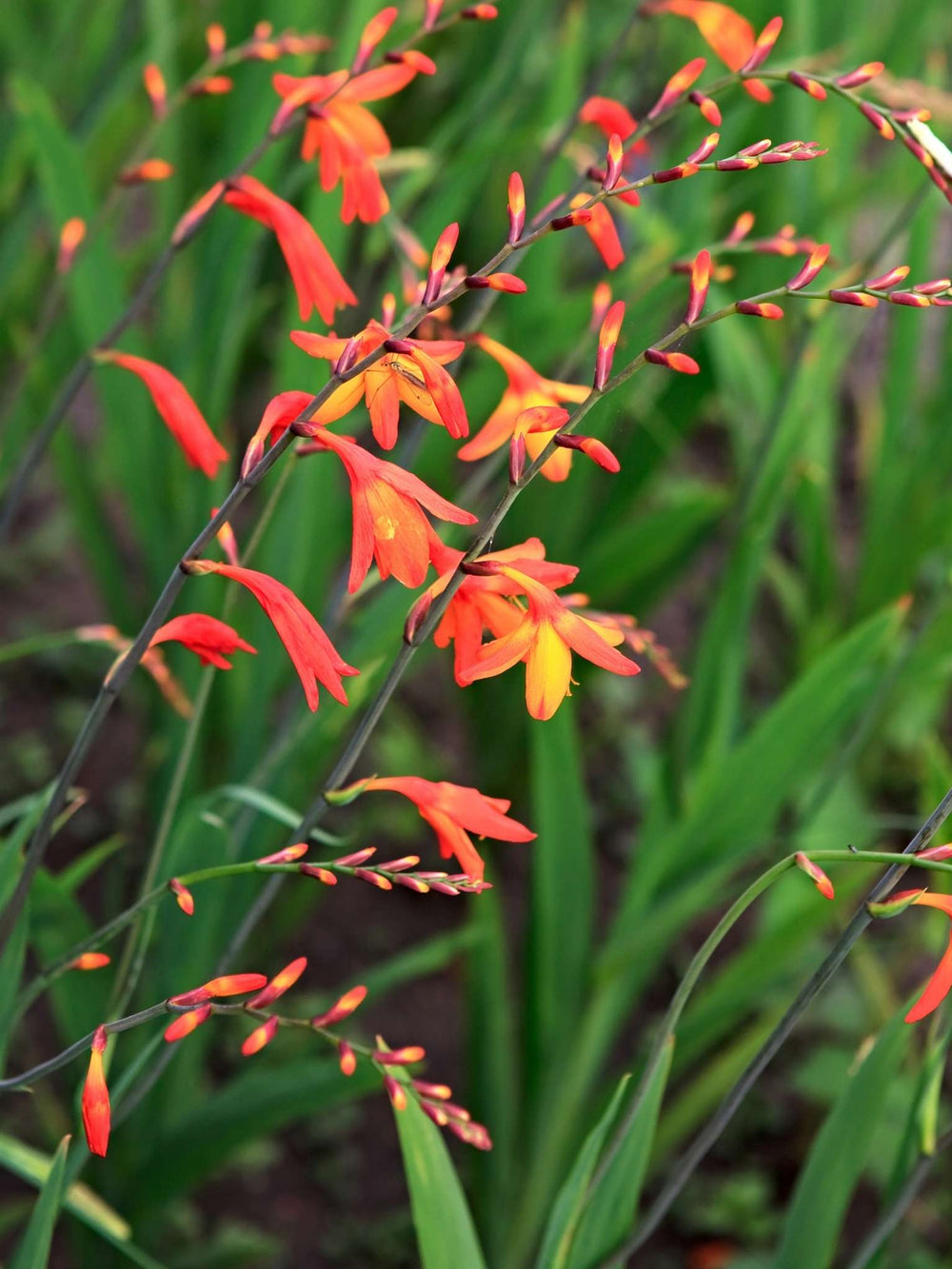 Crocosmia ‘Emberglow’ is a clump-forming perennial with arching stems of vivid red flowers that glow from midsummer into early autumn. The blooms are satiny and trumpet-shaped, rising above sword-like green leaves. Holder of the RHS Award of Garden Merit, it is ideal for Irish borders, coastal gardens, and cut flower arrangements.