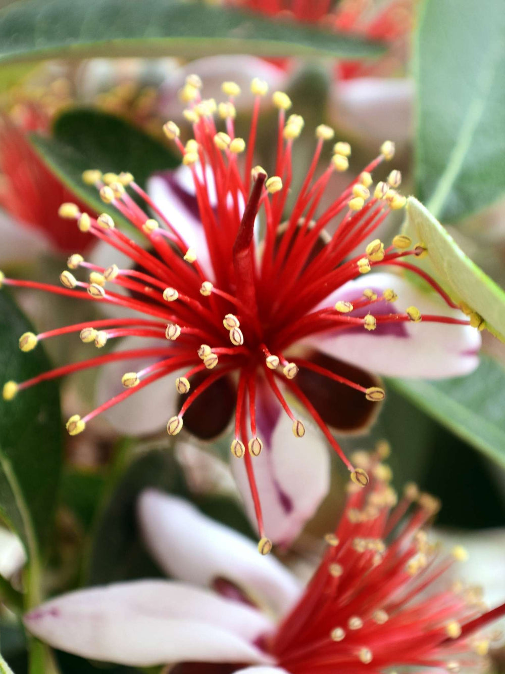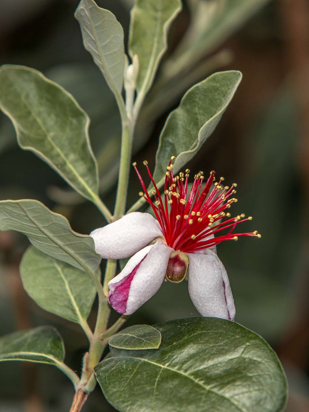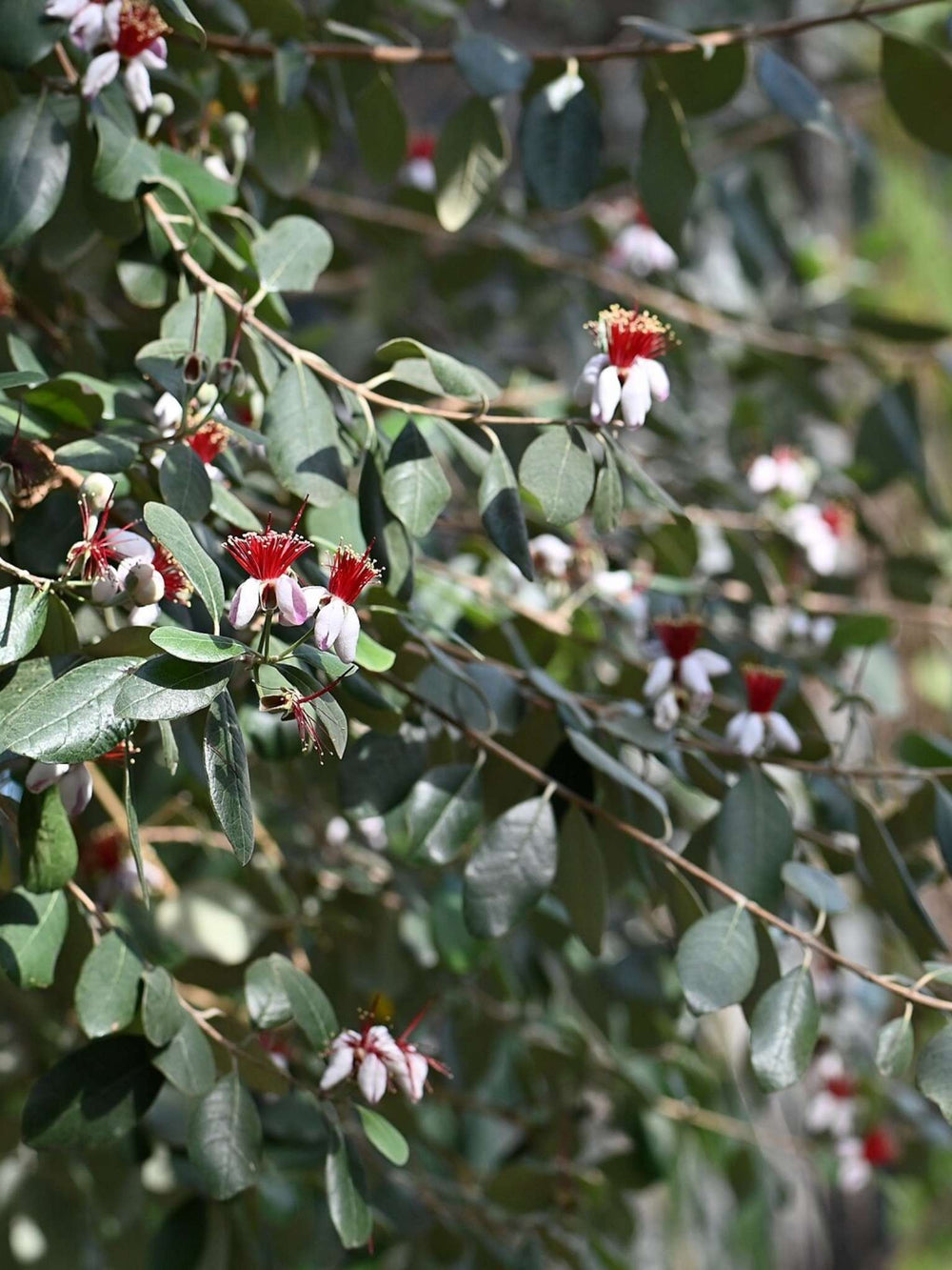 Feijoa sellowiana, or pineapple guava, is an evergreen shrub with neat grey-green leaves felted white beneath. In summer, unusual pink and red flowers appear, sometimes followed by edible, pineapple-flavoured fruits. With its bushy habit and medium size, it suits sheltered, sunny borders in milder Irish gardens. Its flowers are as ornamental as they are practical, lending a touch of the subtropics.