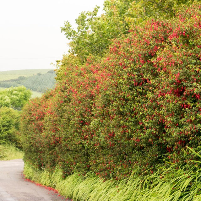 Fuchsia ‘Riccartonii’ is a robust, upright deciduous shrub growing up to 2m, with small dark green leaves sometimes bronzed. From summer into autumn, it produces dainty single flowers with crimson tubes and sepals paired with violet-purple petals. Medium to large in habit, it makes an excellent informal hedge in mild Irish gardens. With its RHS Award of Garden Merit and value for pollinators, it is both practical and ornamental.