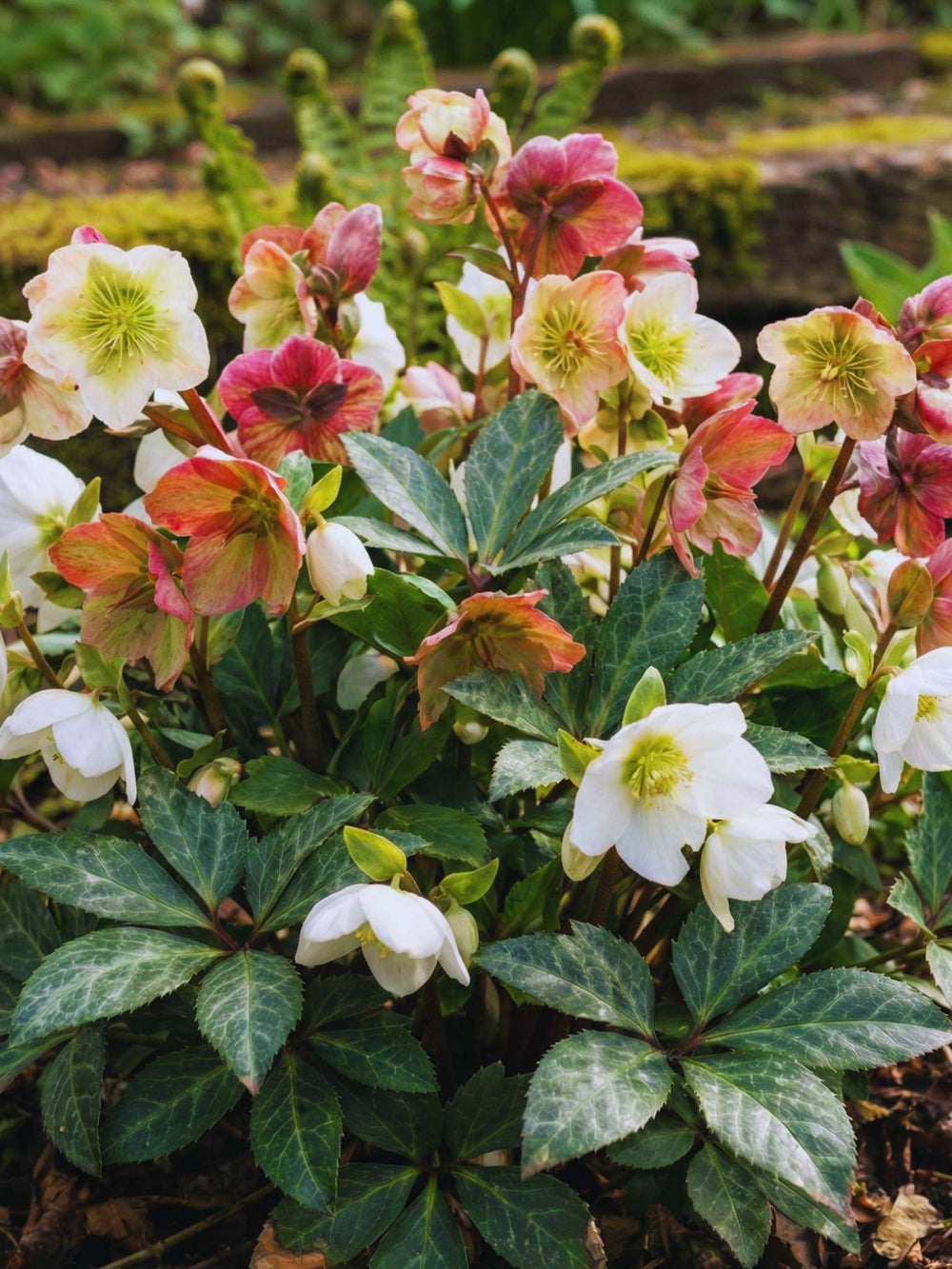 Helleborus × ericsmithii ‘Winter Moonbeam’ forms a low mound of dark green foliage marked with silver veins. From late winter, white flowers age through pink to red, providing long-lasting display. Small and neat, it is ideal for containers or small borders. Pollinator-friendly, good for cutting, and hardy, it provides extended winter interest in Irish gardens.